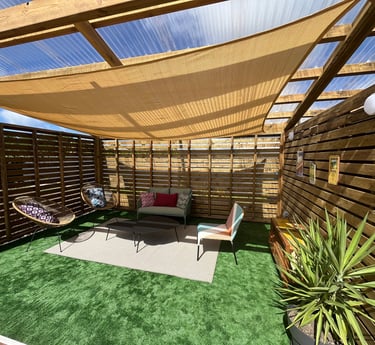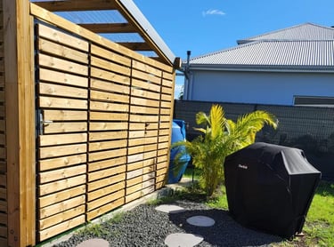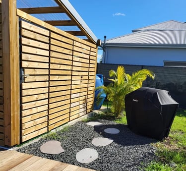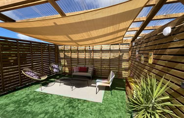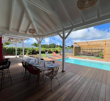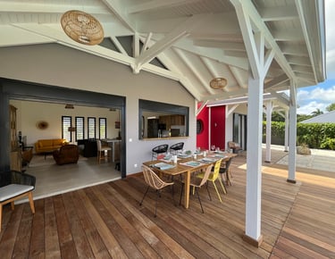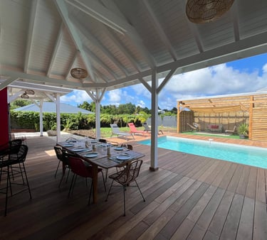 La terrasse couverte en deck est un véritable havre de paix, idéale pour des repas conviviaux en famille ou entre amis.