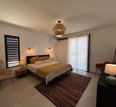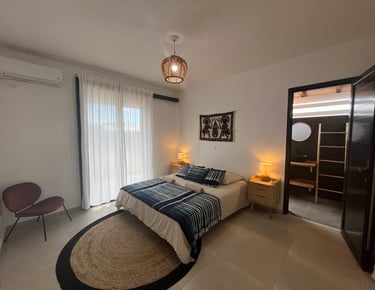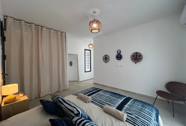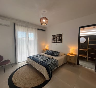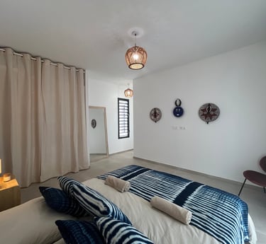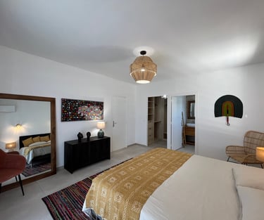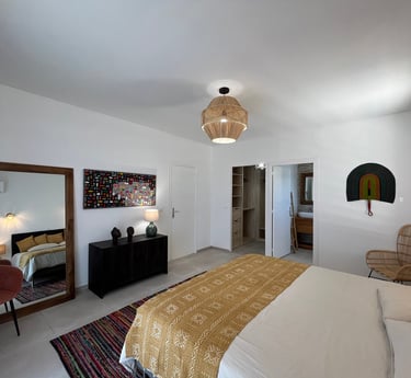 De plus, la chambre est décorée de magnifiques découvertes artisanales provenant de Côte d'Ivoire, ajoutant une note d'exotisme et de culture à l'ensemble de la suite.