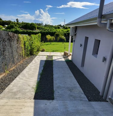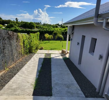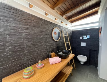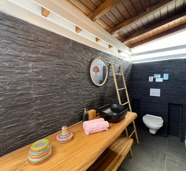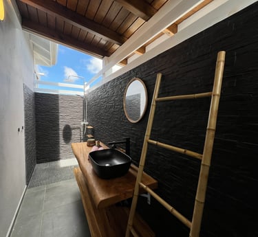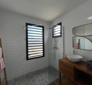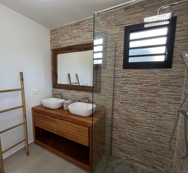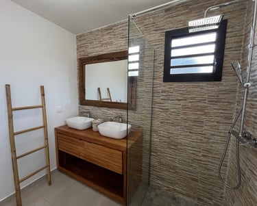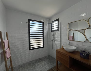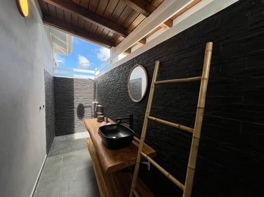 La salle d'eau semi-ouverte invite à une expérience unique de douche en plein air sous le ciel ensoleillé de Guadeloupe et ses belles nuits étoilées.