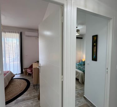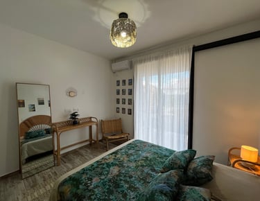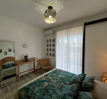 Les deux chambres jumelles, l'une dans une teinte verte amande apaisante et l'autre en vieux rose chaleureux, offrent un espace confortable avec un lit de 160 cm et un grand dressing. Elles s'ouvrent sur une galerie couverte, permettant de profiter d'une vue agréable sur le jardin.