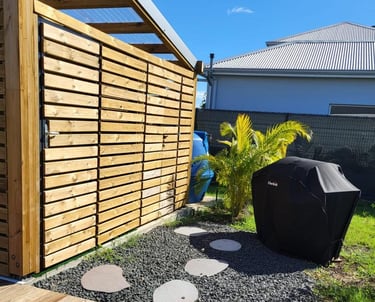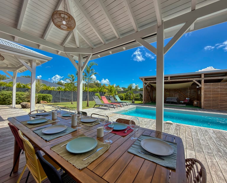 Terrasse couverte avec vue sur la piscine, idéale pour des repas en plein air.